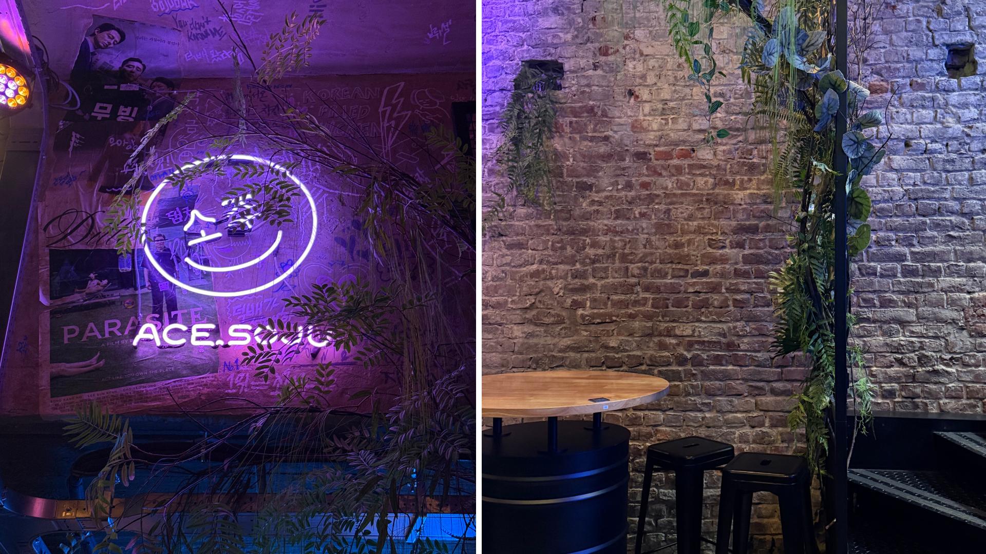 On arrive chez Sojubar en soirée. On a réservé, et on est ravies, vu le monde déjà présent. L’entrée nous met directement dans l’ambiance : lumière tamisée, néons fluo de tous les côtés, plantes tombantes et tags sur les murs. On est définitivement dans un endroit où les cool kids pourront faire leurs meilleurs selfies. La musique est assez forte : on est contentes d’être entre amies, et pas en date.