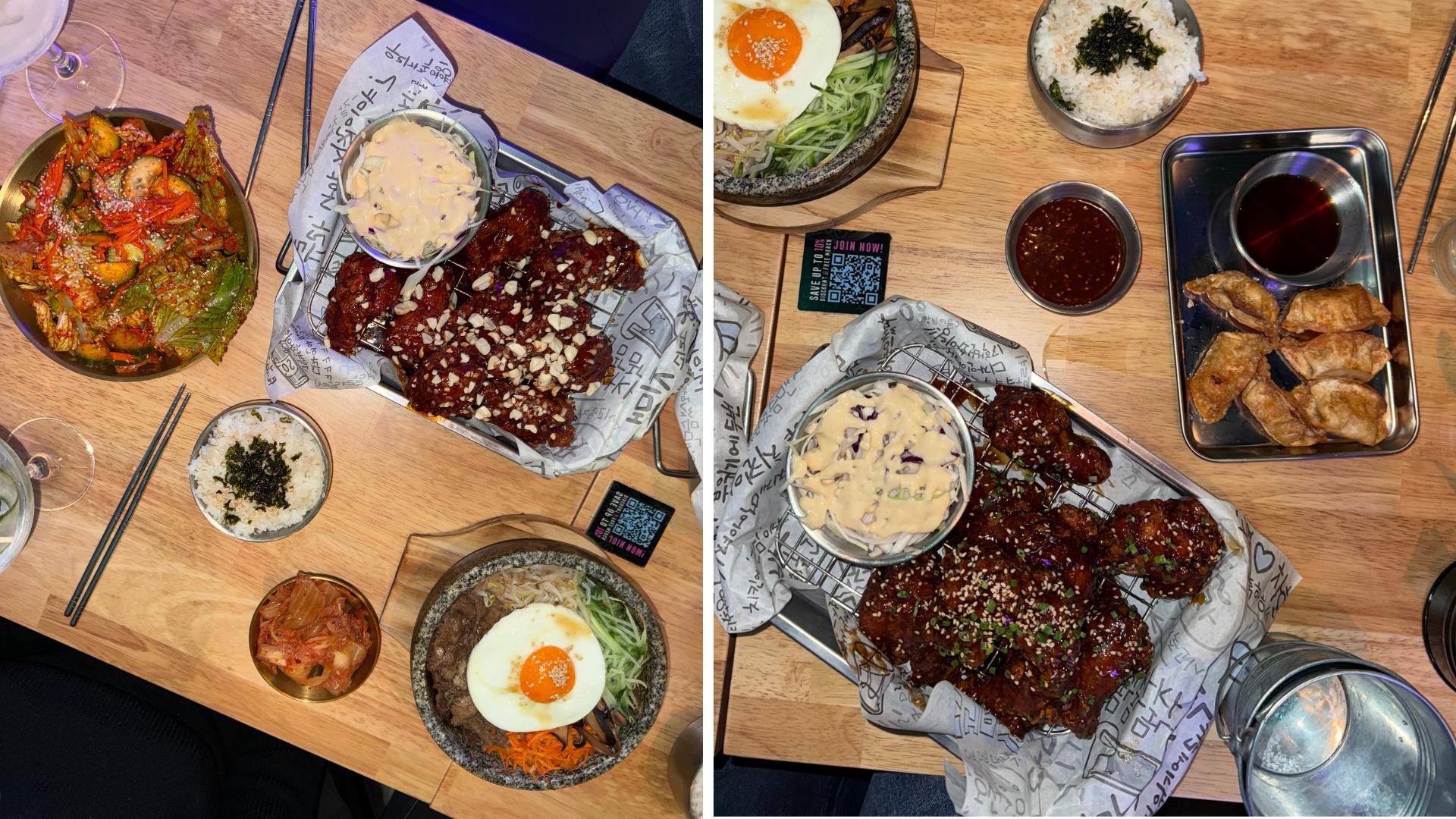 Le service est super chaleureux et rapide. On a commandé deux portions de poulet, un bibimbap, un kimbap, des gyozas et du kimchi. En voyant les assiettes arriver, on s’est dit qu’une seule portion de poulet aurait suffi tant elles sont généreuses. Cela dit, on était bien contentes de goûter deux saveurs différentes : l’une légèrement épicée, l’autre au miel. Les deux ont été validées par tout le monde.