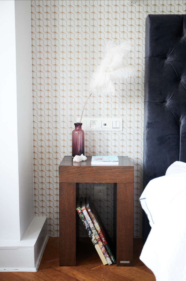 « Et la lumière fut. » Voilà ce qui se murmure lorsqu’on s’immisce dans la chambre de Gaëlle, pourvue d’une immense bow window que le soleil aime chatouiller. L’élégant appui de fenêtre en marbre donne envie de s’y poser, pour observer les passants flâner. Des lierres grimpants suspendus en face du lit et des orchidées égaient la chambre d’une touche de vert. Hormis un mur habillé de papier peint graphique, la chambre est d’un blanc immaculé qui favorise l’apaisement.