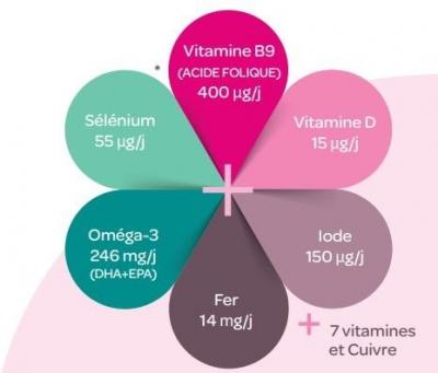 - 1 seul produit pour toutes les étapes de la maternité : préconception, grossesse et allaitement.
