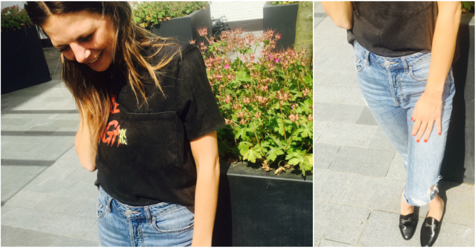 En tant que journaliste mode et beauté, je suis souvent en vadrouille. Et évidemment, où que j'aille, avoir un look tout à la fois tendance et "passe-partout" est la condition sine qua non. Du coup, quand j'enchaîne une conférence de presse avec un afterwork et puis un dîner en amoureux dans le quartier du Sablon à Bruxelles, je dégaine d'office un boyfriend et...des mules. C'est mon gros crush de cette saison (j'en ai déjà toute une collection!). Le t-shirt délavé d'esprit rock, c'est aussi mon petit péché mignon (un de plus). Et pour donner une note chic à ma tenue ce soir, j'ai prévu un blazer noir classique. Et voilà!