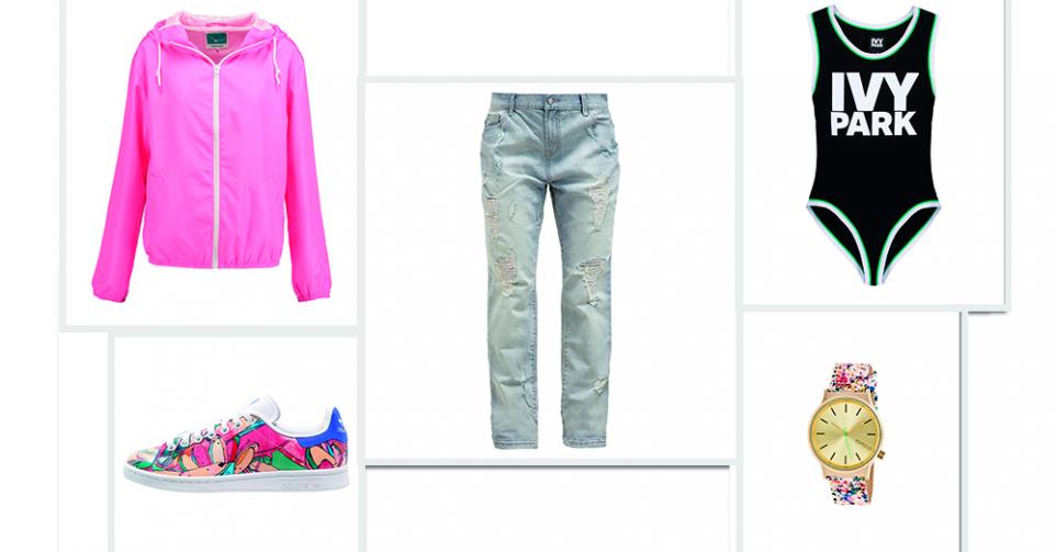 Pour cette tenue sportive, on enfile un body canon de la nouvelle collection de la chanteuse. On choisit un jeans modèle boyfriend déchiré et bien confo comme il faut. De jolies baskets aux pieds, colorées s'il-vous-plaît, histoire de dire qu'on porte des Stan Smith autres que des blanches. Bon, c'est la Belgique, et même au printemps, le risque de pluie s'élève à 99,99%. Alors on chope sa petite veste rose girly et c'est parti! Et ne pas oublier la montre, accessoire pratique pour celles qui RUN THE WORLD!
