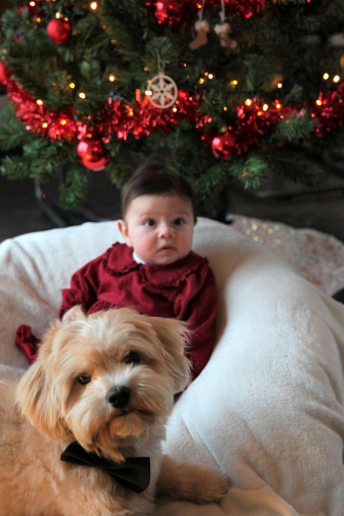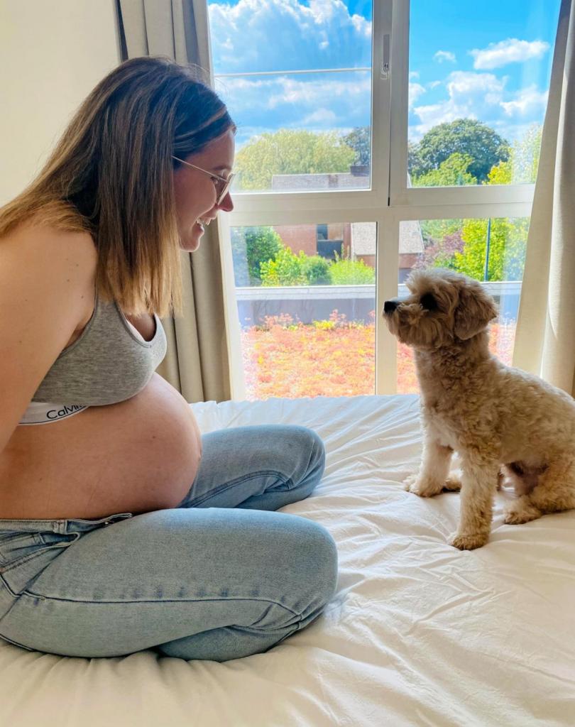 « Cette photo de mon ventre de femme enceinte bien rond et de notre petit chien, notre premier enfant, a été prise par mon ami. »