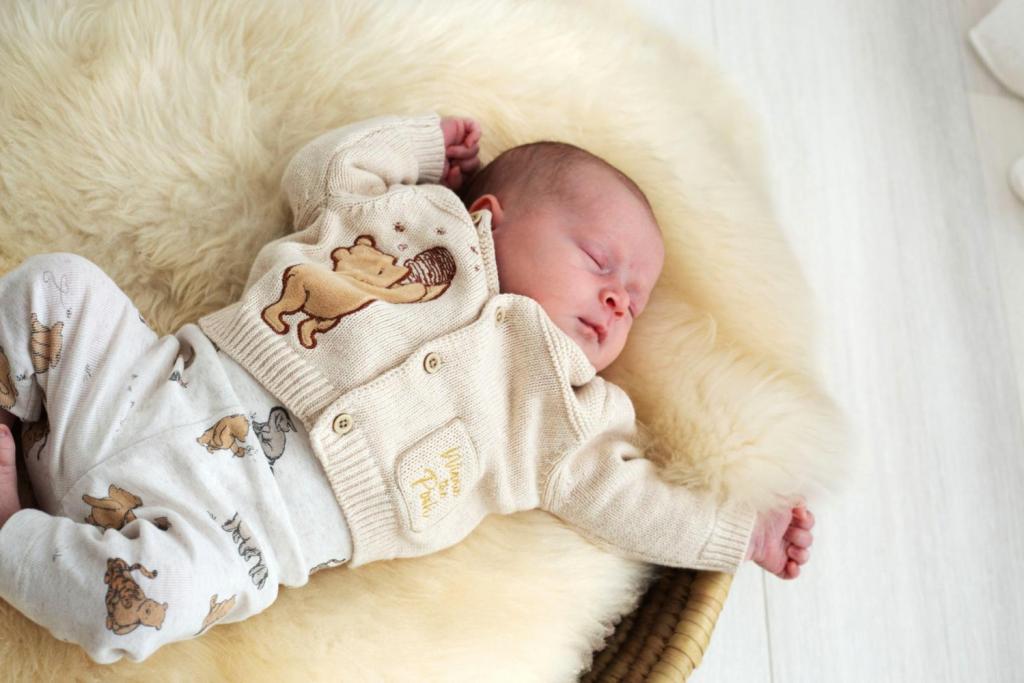 « Quand Roxanne avait 3 semaines, nous avons fait une séance photo nouveau-né. Elle a dormi du début à la fin (rires). Je lui ai mis ses vêtements Winnie l’ourson, tout à fait dans le thème des dragées et du faire-part. »