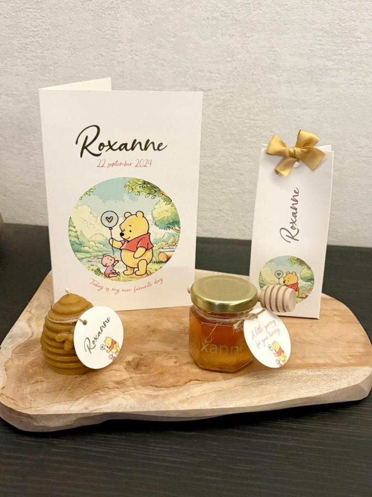 « Je suis une grande fan de Disney, donc personne n’a été surpris que les faire-part soient sur ce thème. Le choix s’est porté sur Winnie l’ourson, et sa chambre de bébé est aussi décorée dans cette idée. Nous avons opté pour des pots de miel et des bougies en forme de ruche. »