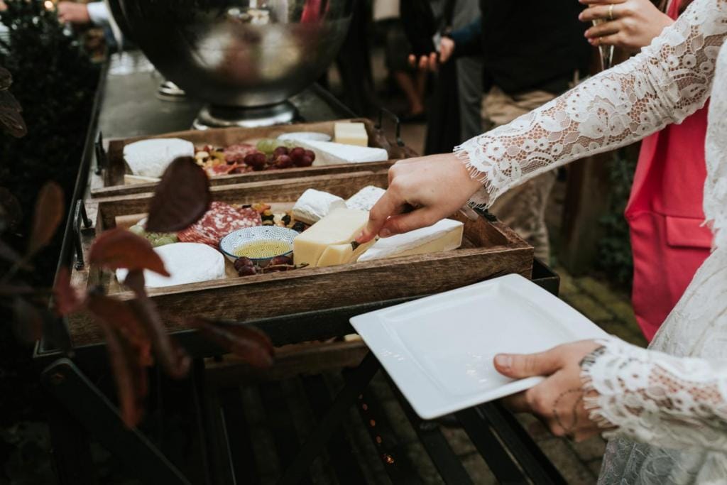 Nous sommes nous-mêmes de grands fans des plateaux fromage-charcuterie, donc c’était logique d’en faire un élément de notre mariage. C’était un DIY très peu cher et rapide à faire: les plateaux ont été faits en 1 heure et ont coûté au total environ 250 € pour 55 invités. Et pas besoin de personnel pour servir.