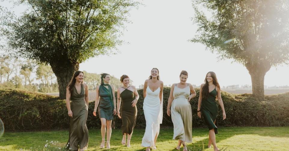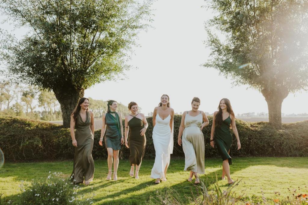 Pour les tenues des demoiselles d’honneur, j’ai choisi la couleur vert olive. J’ai laissé carte blanche à mes amies, car je voulais qu’elles se sentent bien le jour de notre mariage.