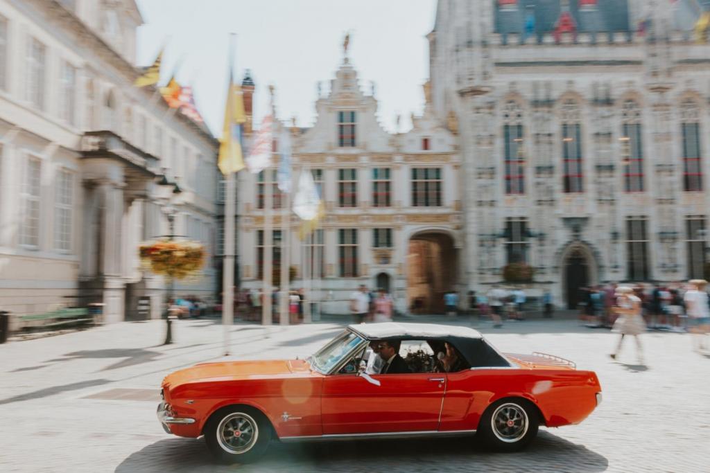Le jour de notre mariage, nous nous sommes déplacés dans une vieille Mustang des années 70. Un ami de la famille qui travaille dans le secteur automobile nous a offert ce magnifique véhicule de cérémonie en guise de cadeau de mariage. Sa couleur estivale était parfaitement assortie à cette journée!