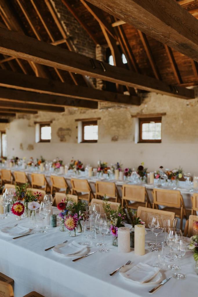 À l’intérieur, nous avons installé une série de longues tables que nous avons recouvertes de nombreuses fleurs, notamment des dahlias aux couleurs vives, et de superbes décorations que nous avions louées auprès de Femat. À l’extérieur, nous avions également installé une tente avec des tables hautes et une piste de danse.