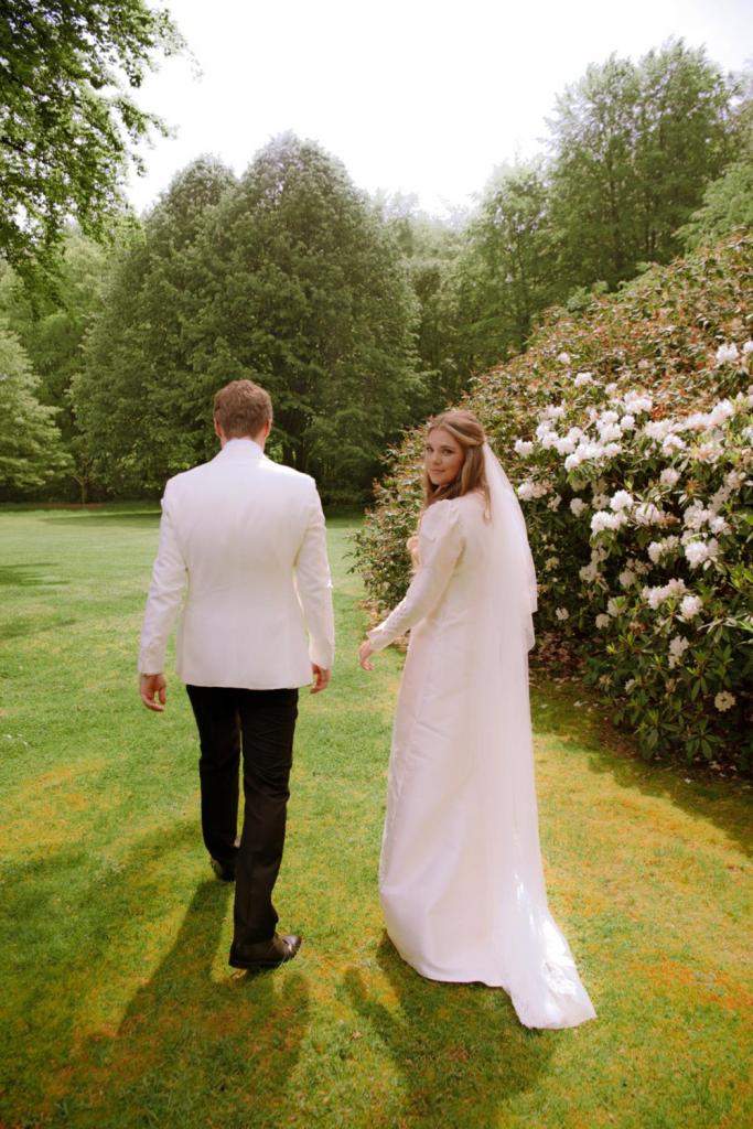 Pour la cérémonie religieuse et la fête, j’ai opté pour une robe longue avec de magnifiques manches et un voile en soie romantique. J’aimerais bientôt l’accrocher au-dessus du berceau de notre bébé. Les fleurs ont été cousues à la main.