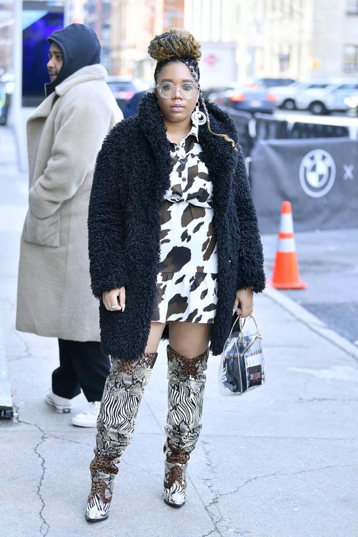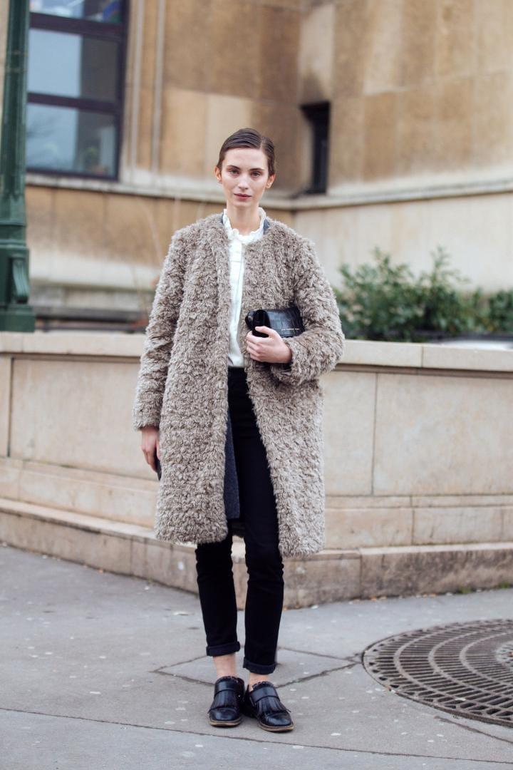 Mini-jupe + manteau teddy + bottes (très) hautes.