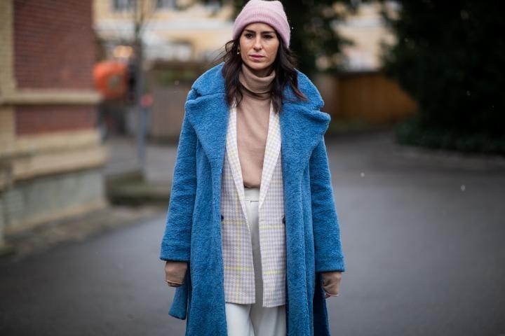 Col roulé + blazer + pantalon + manteau teddy + bonnet.