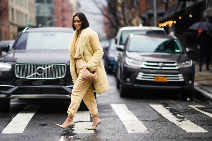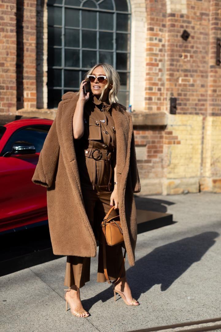 Combinaison + manteau teddy + sac à main + escarpins nude.