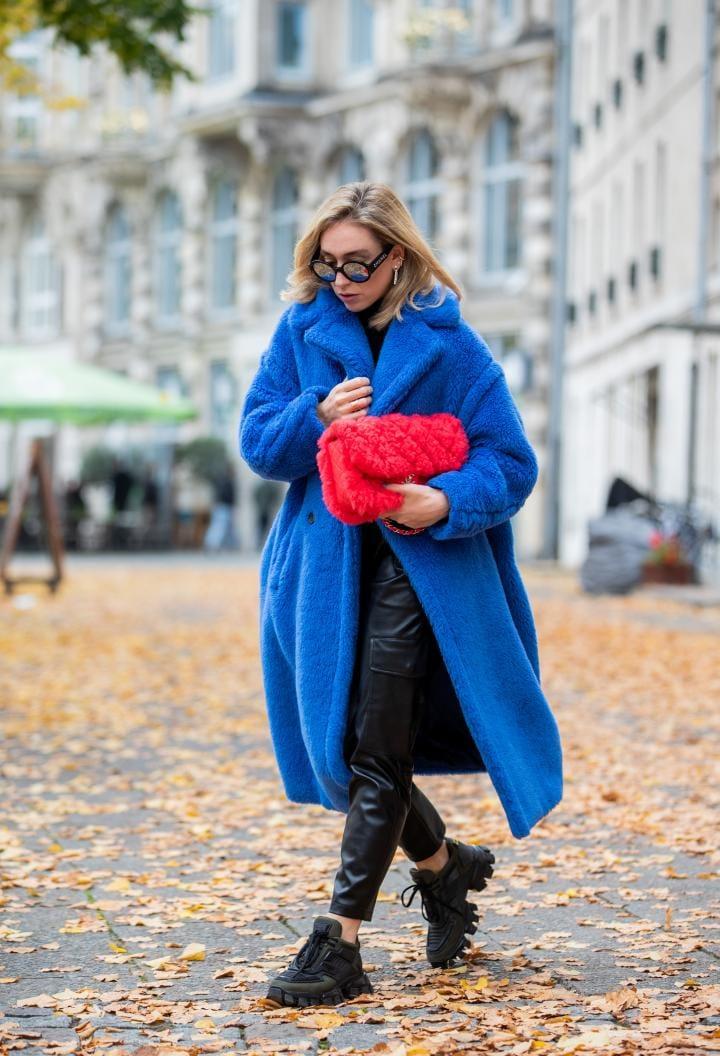Col roulé noir + pantalon similicuir + manteau teddy couleur flash + baskets plateformes + sac à main neon.
