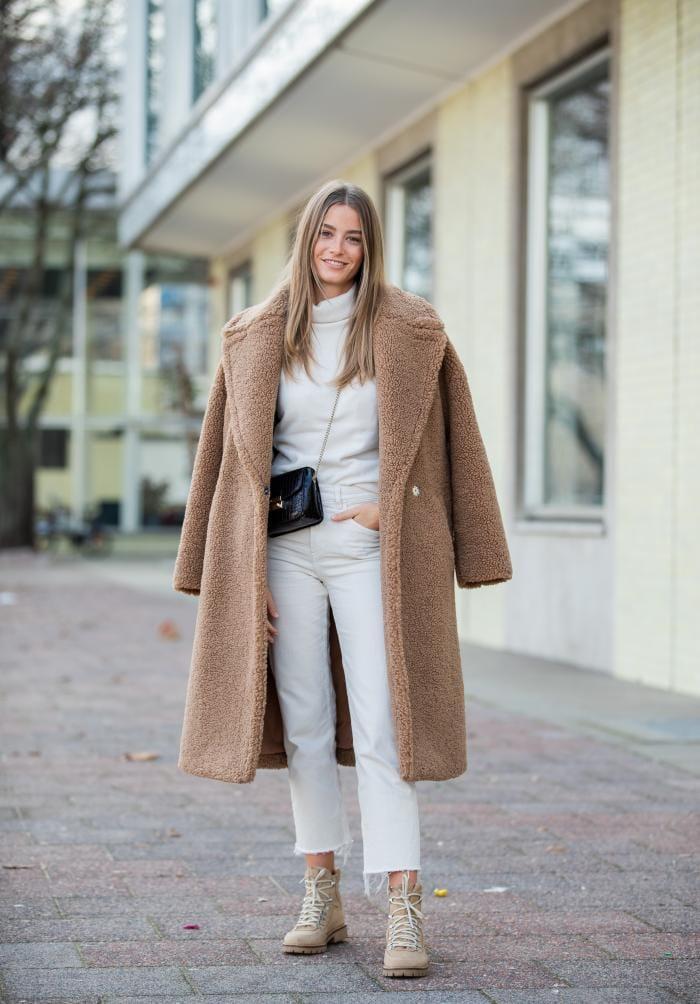 Jeans blanc + col roulé + manteau teddy + bottines de randonnée.