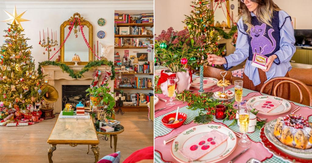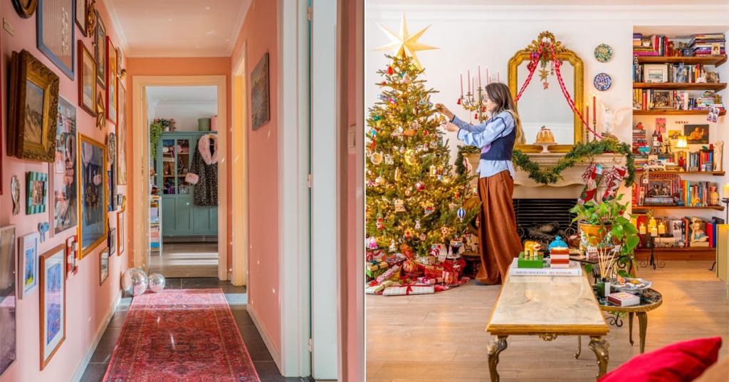 De haard versieren we steevast met een mix van nieuwe en oude kerstdecoratie, geïnspireerd door gezellige Britse cottages. Ik voeg graag wat roze en blauw aan onze decoratie toe om het traditionele kleurenpalet te doorbreken. De kerstsokken gebruiken we om kleine cadeautjes in te verzamelen. Victoire maakte ze trouwens zelf met restjes stof.’