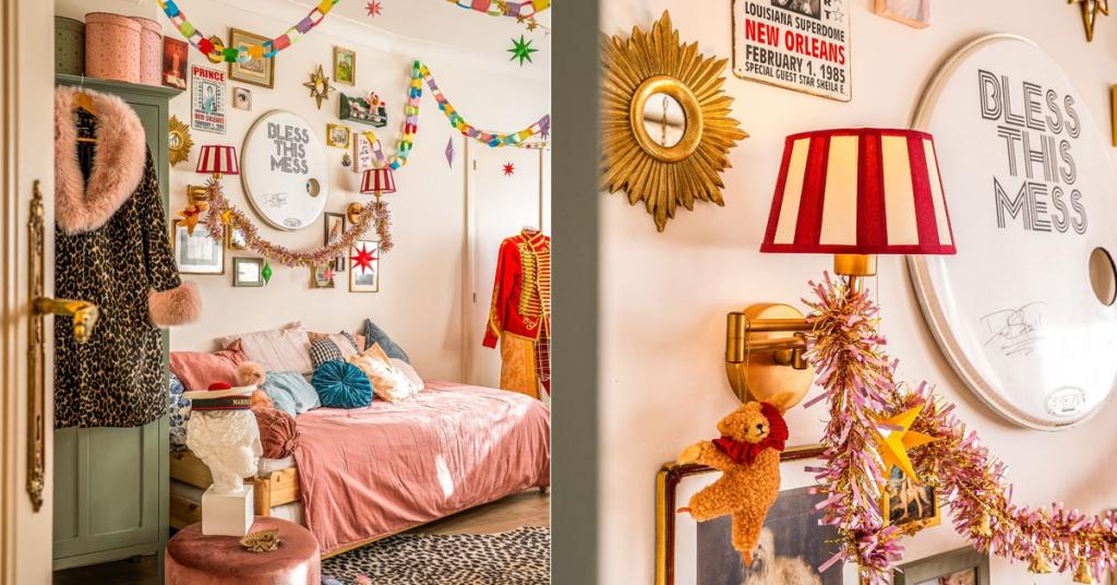 Victoire: ‘In de logeerkamer kozen we voor een glam rock Christmas. Het luipaardtapijtje vonden we op Vinted, en de drum head aan de muur is van een van onze favoriete bands. Als kerstdecoratie combineerden we glitterende guirlandes met zelfgemaakte papieren slingers en sterretjes. Het is een budgetvriendelijke en eenvoudige manier om een ruimte te versieren in je favoriete kleuren. Bovendien is het ontspannend om te knutselen terwijl je kerstfilms binget, dus zet “Love Actually” maar op en go for it (lacht)!’