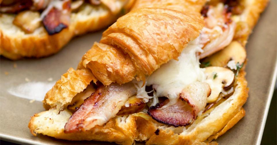 - Snij de croissants in tweeën. Beleg met het spek, de kaas en de champignons. Vouw de croissants dicht en serveer meteen.