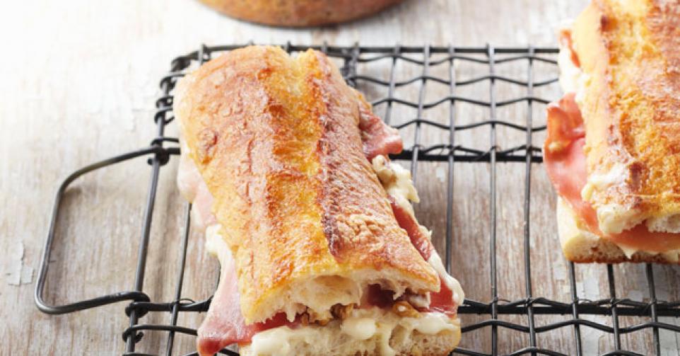 3. Snij het stokbrood in vier gelijke stukken, halveer ze overlangs. Bestrijk de onderste helft van het brood met kaassaus en beleg met sneetjes ham. Verdeel er de walnoten over. Dek af met de bovenkant van het brood en bestrijk met gesmolten boter. Bestrooi met de rest van de kaas.