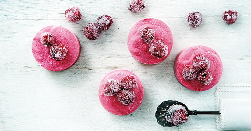 7. Neem de ijstaartjes uit de diepvries en zet ze op een bord. Verwijder de ring en het bakpapier en laat ze in 5-10 minuten iets zachter worden. Garneer de semifreddini met de gesuikerde frambozen.