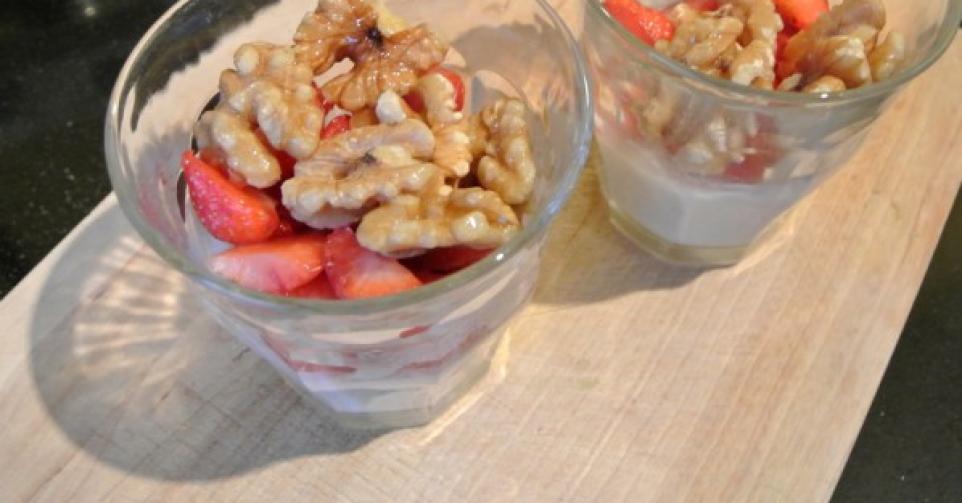 Maak de topping door de walnoten te besprenkelen met 1 eetlepel agave siroop en de aardbeien in kleine stukjes te snijden.