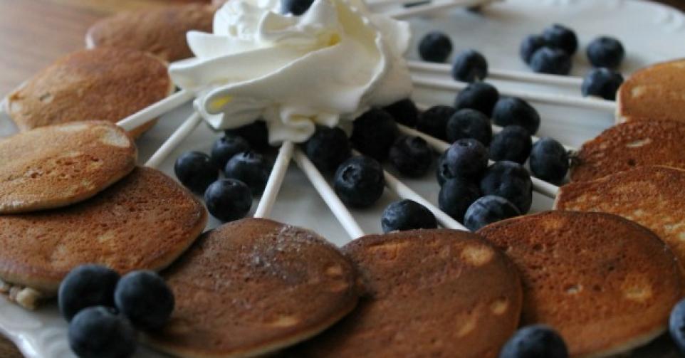 Je kunt de Pancake Pops heel leuk als dessert presenteren met bijvoorbeeld bosbessen, aardbeien en slagroom.