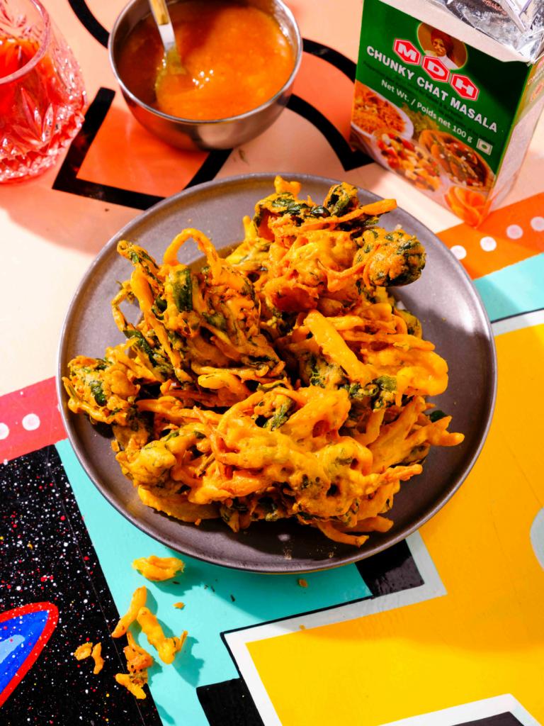 3. Verhit olie in een friteuse of zware pan. Test de temperatuur met een plakje ui: het moet zachtjes pruttelen. Maak met een eetof ijslepel kleine balletjes van het bhaji-mengsel. Bak de balletjes tot ze goudbruin en gaar zijn. Draai ze daarbij af en toe om.