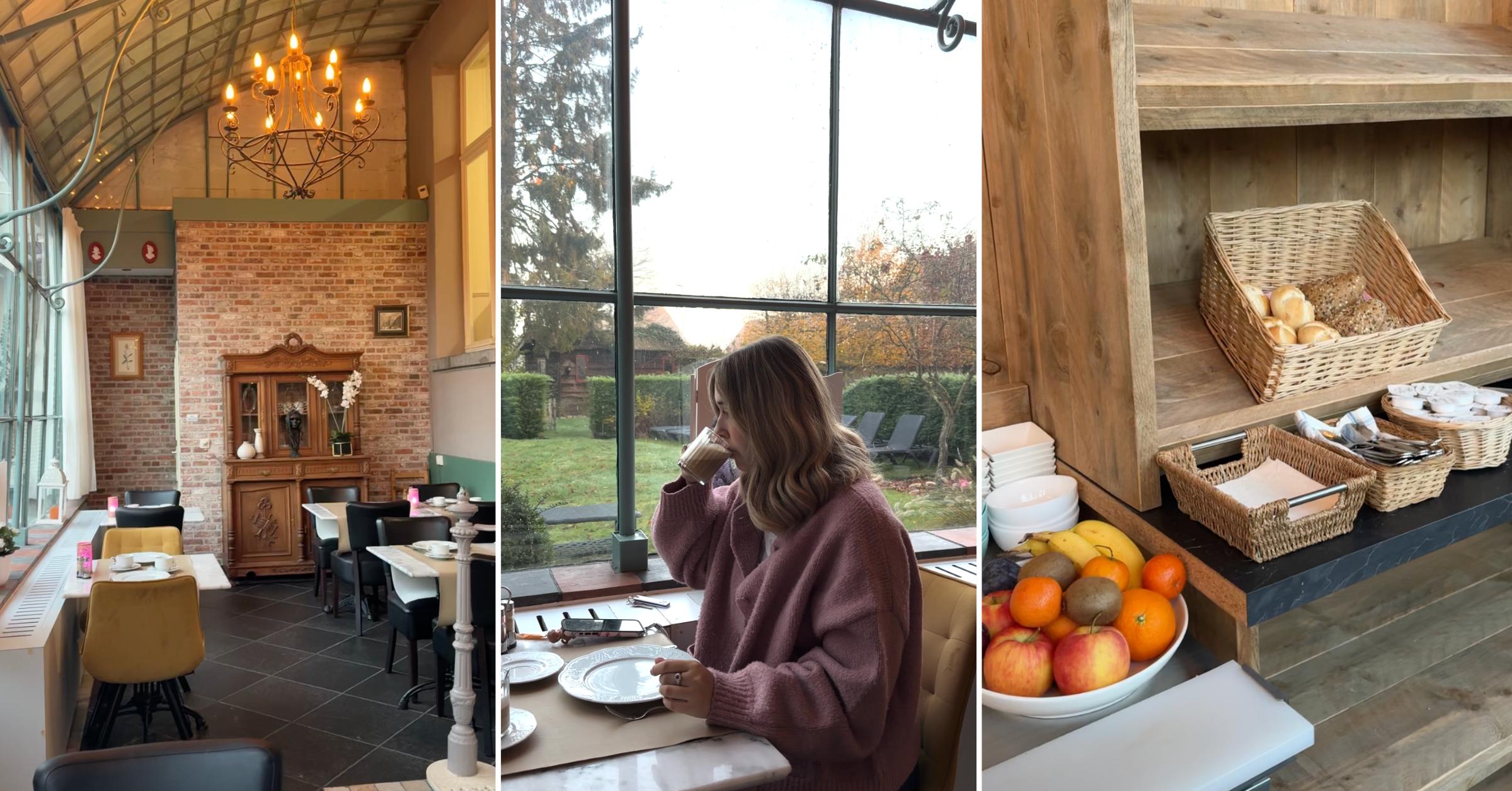 Voor het ontbijt trokken we naar de orangerie, en ook hier werden we weer warm onthaald door de eigenaar, die zelfs een cappuccinootje voor ons klaarmaakte. Met vers afgebakken croissants en koffiekoeken en een heel assortiment aan (zelfgemaakte) spreads en toppings genoten we van ons ontbijt met een prachtig uitzicht op de tuin van het pand.