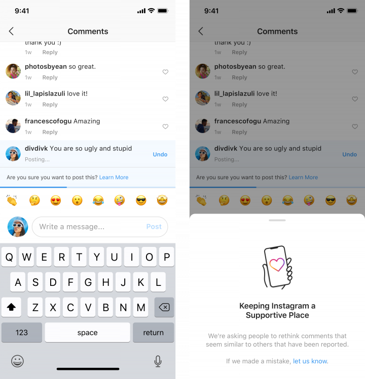 Bij Instagram zijn ze zich bewust van dit probleem, en besluiten ze nu om de strijd aan te gaan tegen online pesten. Ze lanceren daarom twee nieuwe functies. Bij de eerste functie krijgen gebruikers die een negatieve reactie willen plaatsen de melding: ‘Weet je zeker dat je dit wilt posten?’ Instagram herkent die gemene opmerkingen omdat die vaak gerapporteerd worden en kan die aan de hand van artificiële intelligentie onderscheiden van normale comments. Hierdoor kan iedereen in de toekomst twee keer nadenken voor ze iets kwetsend posten. ‘Uit verschillende testen blijkt dat het mensen echt wel aanzet om hun haatdragende opmerking te verwijderen en iets minder grof te plaatsen’, aldus Adam Mosseri, het hoofd van Instagram.