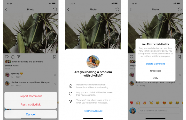 Een tweede maatregel tegen online pesten is de ‘Restrict’-functie. Hierbij kan je bepaalde gebruikers muten waardoor hun reacties op jouw foto’s in de toekomt onzichtbaar worden voor jou en je volgers. De internettrollen zelf hebben dit niet door, want enkel zij zien hun comments nog. ‘We hoorden van jonge mensen in onze community dat ze terughoudend zijn om hun pester te blokkeren, te rapporteren of te ontvolgen omdat dit de situatie kan doen escaleren’, vertelt Adam. ‘Vooral als die pestkoppen deel uitmaken van hun leven offline.’ Wil je toch nog een van hun commentaren openbaar maken, dan kan je daar toestemming voor geven. ‘Restricted’-gebruikers kunnen ook niet zien of je online bent en dat je hun privéberichten hebt gelezen.