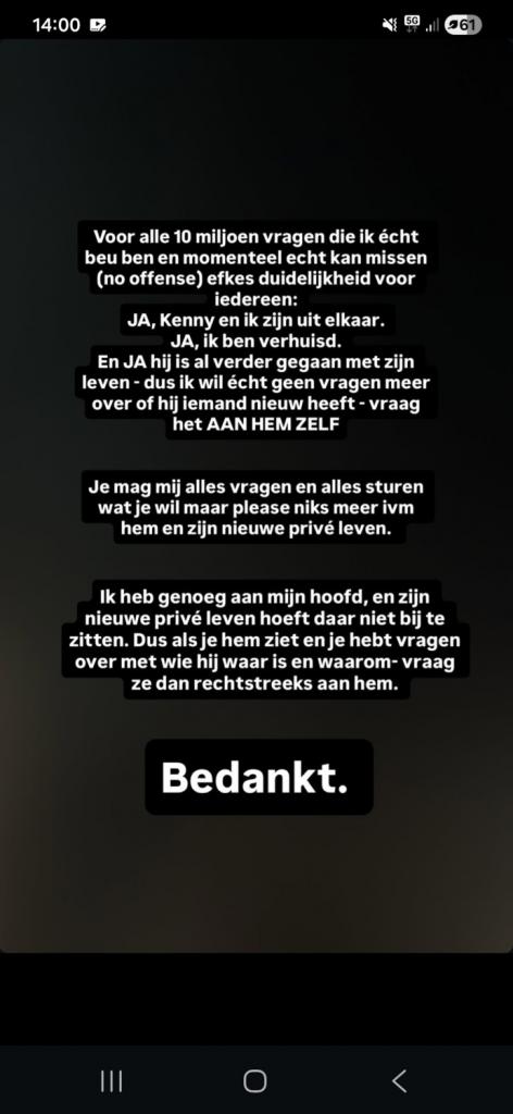 Vier jaar later lezen we triestig nieuws op de Instagrampagina van een van de andere koppels. Amber schrijft dat Kenny en zij geen koppel meer vormen. ‘Kenny en ik zijn uit elkaar’, typt ze. ‘Ik ben verhuisd en hij is al verder gegaan met zijn leven.’