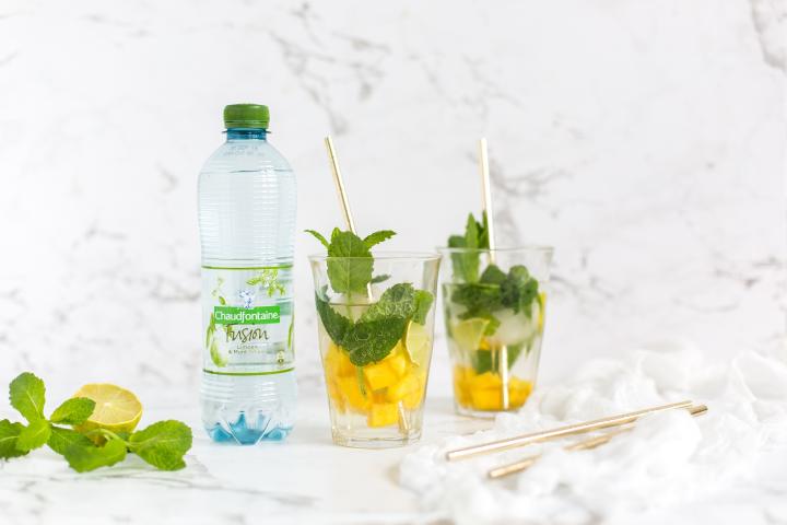 20 g verse munt – sap van 2 limoenen – 200 ml muntsiroop – 4 el rietsuiker – 1 mango, in stukjes – 600 ml Chaudfontaine Fusion Limoen & Munt Smaak – ijsblokjes