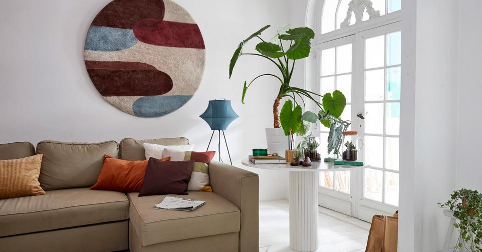 2. Neem nu dat vloerkleed dat al jaren in de woonkamer ligt (zo lang al dat je het zelfs niet meer ziet liggen). Wat als je het eens op een originelere manier in de kijker zet? Hoe? Geef het kleurrijke accenten en hang het aan de muur. Een topidee waarmee je je interieur een originele draai geeft zonder iets te hoeven kopen en met wat je al in huis hebt.