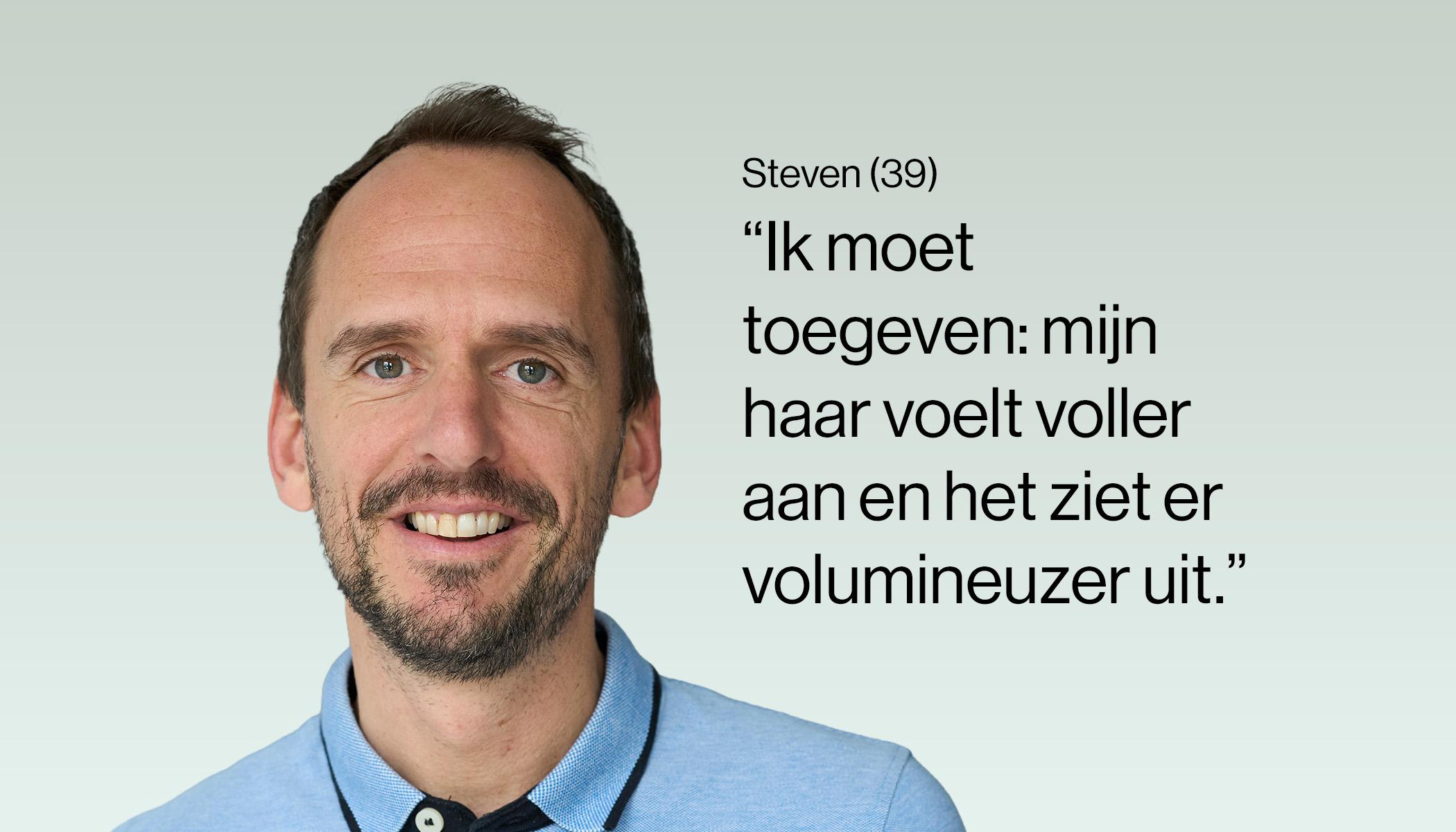 Steven: “Ik heb van nature fijn, dun haar, net als mijn vader. En net als bij hem merk ik dat mijn haarlijn toch wel wat begint te wijken. Tja, da’s de genetica, daar kom je niet onderuit. Veel haarverlies? Niet echt, maar toch genoeg om de Elseve Fiber Booster-lijn te willen testen. Ik verwacht niet dat ik morgen een volle bos haar zal hebben, maar wil toch wel weten wat het doet. Een shampoo én een serum is even wennen, want normaal gezien is het bij mij wassen en klaar... Het vraagt iets meer tijd dan normaal in de badkamer. En merk ik resultaat? Ik moet toegeven: mijn haar voelt voller aan en het ziet er volumineuzer uit. Niet buitengewoon, want dat was het haarverlies ook niet, maar genoeg om tevreden mee te zijn.”