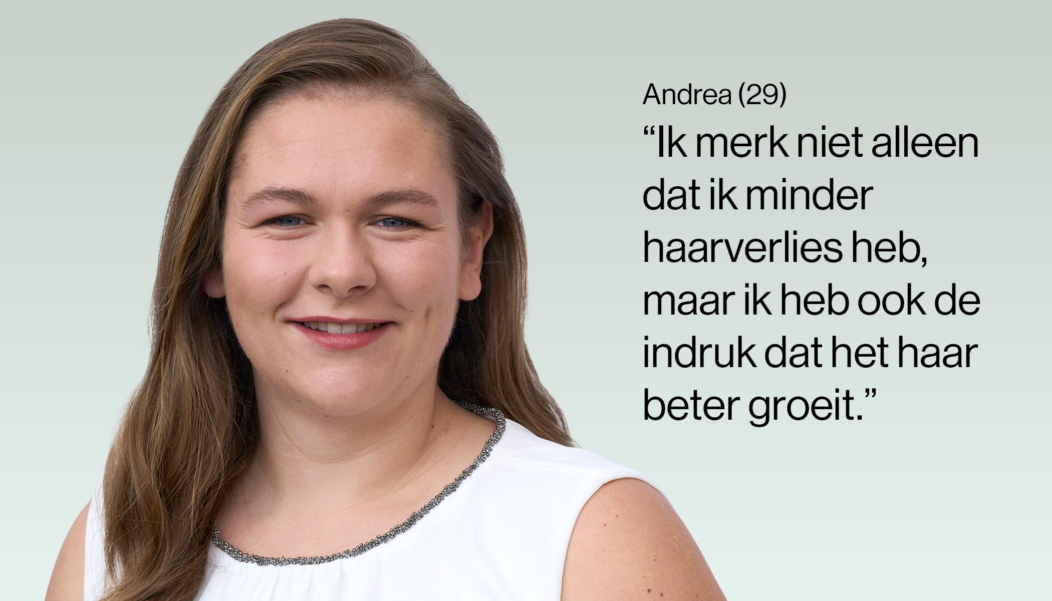 Andrea: “Ik heb van nature dik en vol haar, maar na de bevalling van mijn dochter ben ik ervan geschrokken hoe erg het uitviel. Onder de douche verloor ik hele plukken. En ik moest om de dag alle haren uit mijn borstel halen. Lily is nu zes maanden. Ik kon me niet herinneren dat ik dat ook had na de geboorte van mijn zoon Vinz, die nu vier is. Ik weet wel dat haarverlies normaal is na een zwangerschap, maar ik maakte me toch zorgen of het nog goed zou komen. Daarom wilde ik deze kuur met Elseve Fiber Booster proberen, met de shampoo, conditioner en het serum. Ik ben blij het met resultaat. Ik merk niet alleen dat ik minder haarverlies heb, maar ik heb ook de indruk dat het haar beter groeit. Er groeien nieuwe haartjes, dat kan ik goed zien bij mijn voorhoofd.”