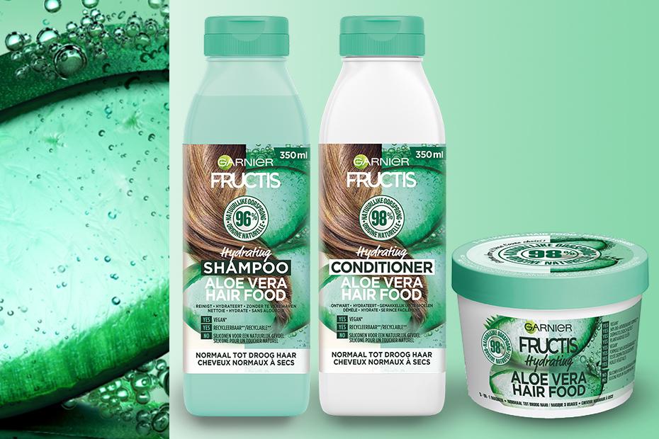 Wie normaal tot droog haar heeft, moet het zeker voldoende hydrateren. Daarom heeft Fructis de collectie Aloe Vera Hair Food ontwikkeld, die hydratatie en zachtheid boost.