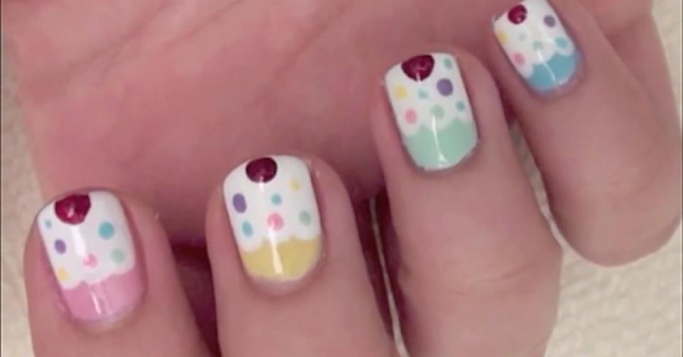 'De kers op de taart': zoek voor deze afwerking een voorwerp met een fijn puntje, zoals bijvoorbeeld een tandenstoker of een haarspeldje. Voor de kers op je cupcake gebruik je rode nagellak. Om het geheel nog een tikkeltje feestelijker te maken, ga je best voor shimmer red. Dip je voorwerp in de nagellak, dep niet te veel af, en maak bovenaan je nagel een dikke stip in het midden.