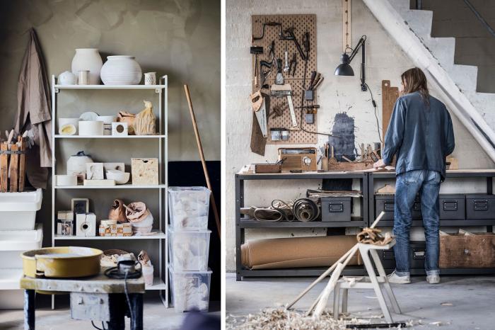 Stellingkast, wit, 80 x 38 x 160 cm, JONAXEL, € 39,99. Werkbank, zwart/grenen triplex, 110 x 55 cm, BROR, € 129.