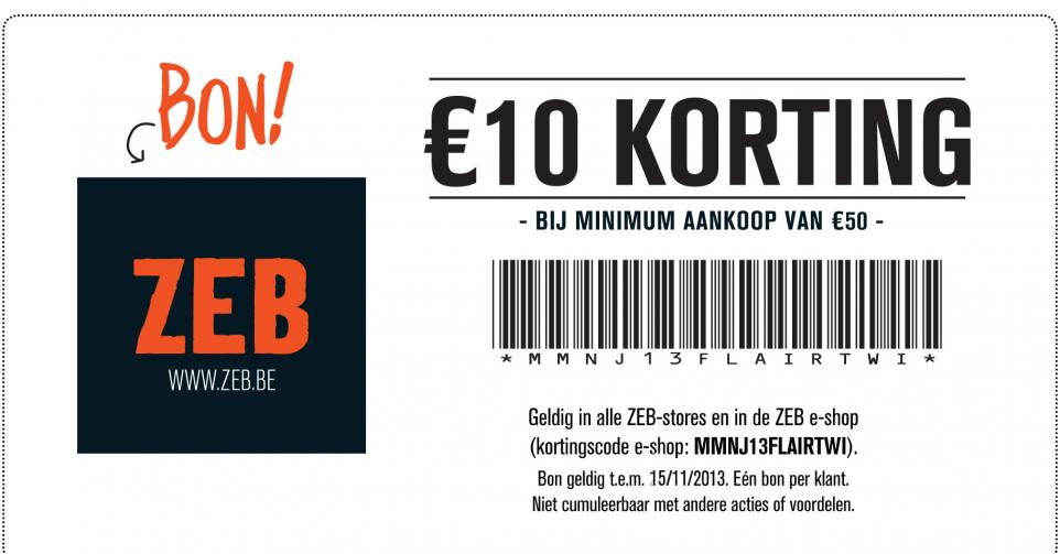 Krijg 10 euro korting bij ZEB (bij aankoop van minstens 50 euro). Print deze bon, neem 'm mee naar de winkel en shop till you drop. De bon is geldig tot en met 15/11, wees er dus snel bij.