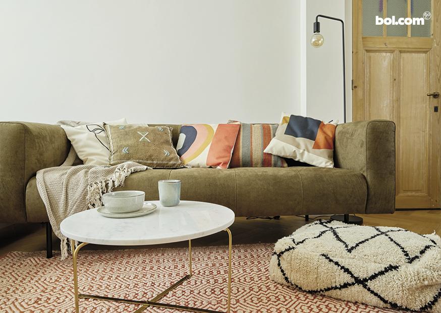 De olijfgroene zetel, het tapijt met geometrische print en de marmeren salontafel doen het prima met strakke zwart-wit patronen en een afgelijnde staande lamp maar ook met kleurrijke kussens met bohemien prints. Zo krijg je een perfecte mix van industrieel en boho!
