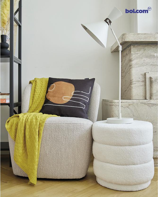 Als jullie er toch niet uitraken, zijn neutrals de ideale oplossing om tot een compromis te komen. Een witte bouclé zetel met een bijpassende poef en stijlvolle tafellamp kan je alleen maar mooi vinden, toch? Aankleden en afwerken kan met kussens en plaids die je naar hartenlust kan wisselen. Iedereen blij!