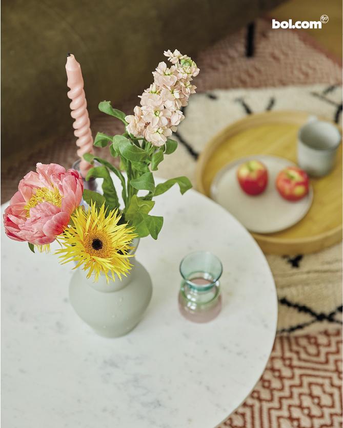Een interieur in beweging is altijd nét een tikje interessanter. Wissel een mooie vaas van plaats, haal extra kleur in huis met een bont boeket of laat een speelse kandelaar je woonkamer opleuken. Door regelmatig te switchen, maak je je woonkamer bij momenten net iets meer boho of net iets strakker dan anders.