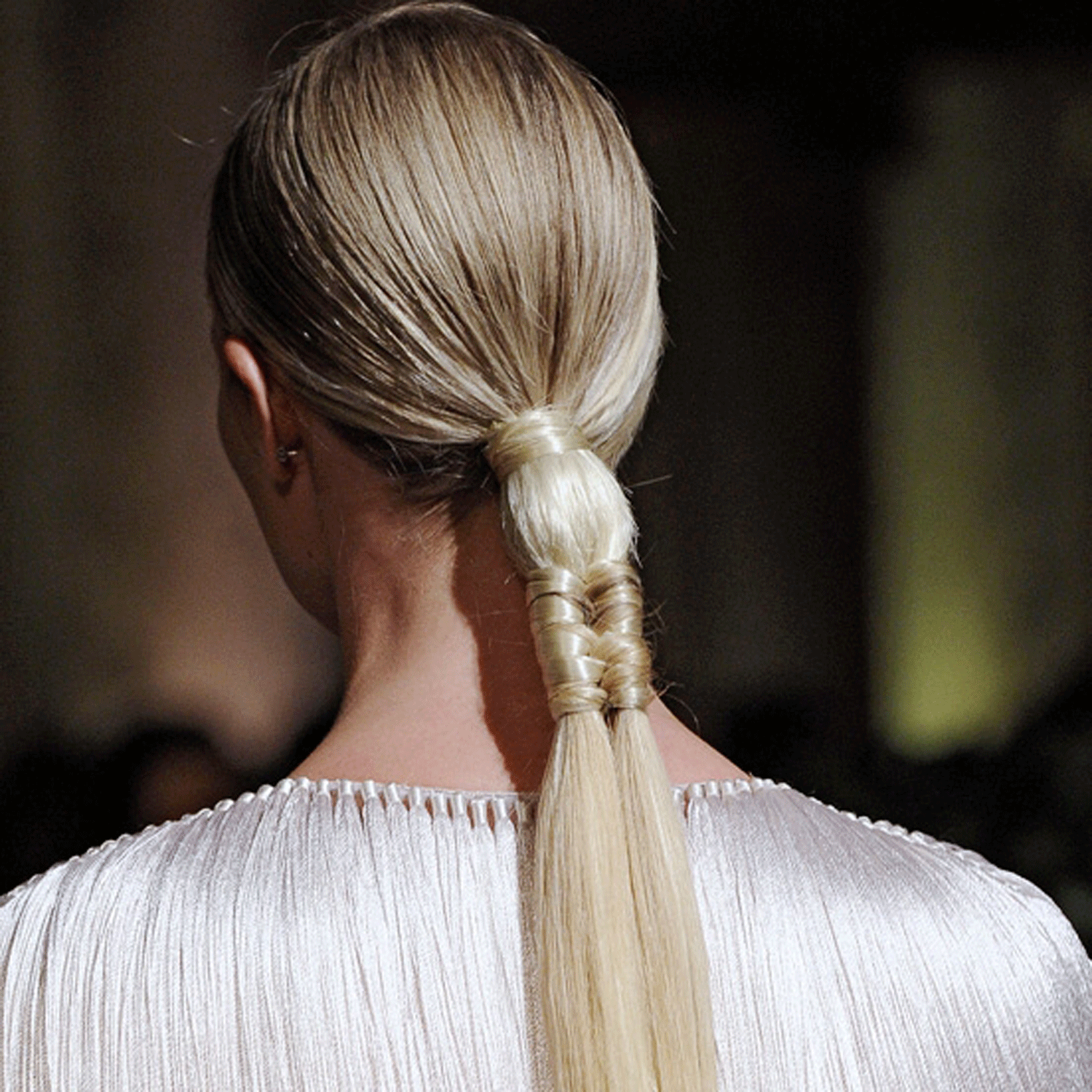 - Neem een dunne strook haar en wikkel die rond de basis van de paardenstaart om het elastiek te verbergen. Met een schuifspeldje het eindje van de haarstrook onder de staart.