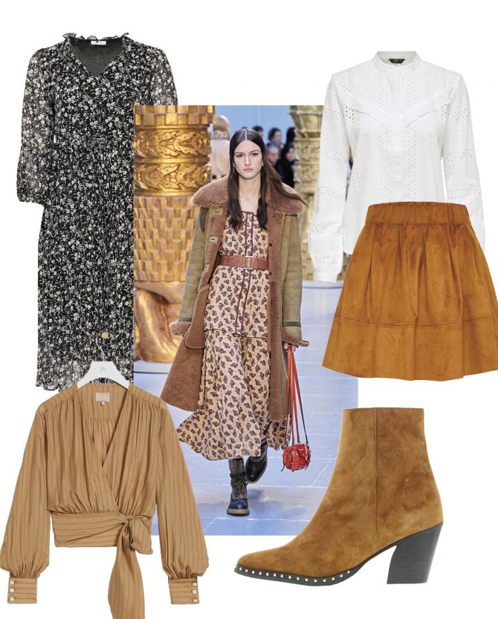 Daar zijn de jaren 70 weer! Hippie chic vertaalt zich anno 2020 naar paisley- en bloemenprints, pofmouwen en strikbloezen, broderie en suède, wijde broeken en hoge laarzen.