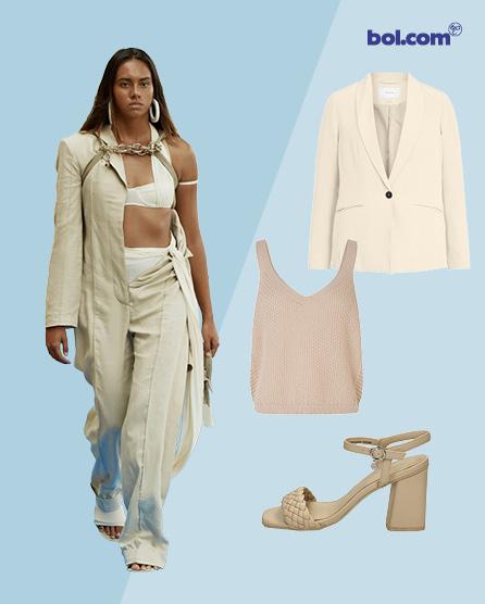 Laat het aan Simon Porte Jacquemus over om neutrals sexy te maken. Omdat een witte bikini onder een beige opengeritste jumpsuit niet bepaald officeproof oogt, opteren wij voor een crop top, broek en blazer in tijdloze tinten.