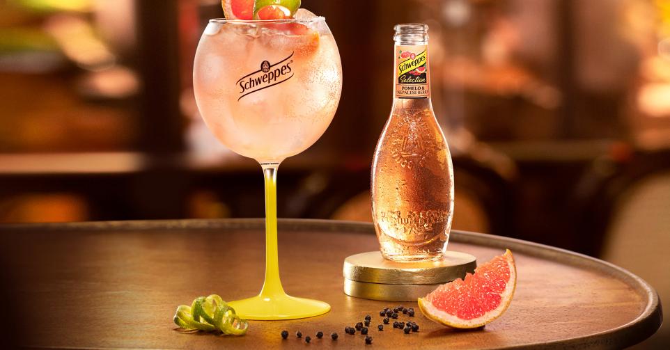 - Houd je glas lichtjes schuin en giet er traag de Schweppes Selection Pomelo & Nepalese Berry bij.