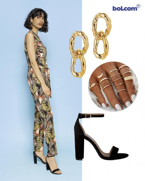 Styliste Liza: ‘Een jumpsuit met exotische bloemen- of plantenprint is allesbehalve basic. Dit mouwloze exemplaar met riem is ideaal om de zomer mee in te zetten. Het drukke motief eist alle aandacht op, dus kan je je accessoires eenvoudig houden. Kies bijvoorbeeld voor tijdloze zwarte sandalen met hak en een beetje bling.’