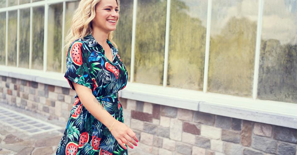 ‘Ik draag gewoon zelf heel graag lichte, zomerse stoffen. Een kledingstuk moet voor mij vooral heel comfortabel zitten. Daarom is een lichte maxi-jurk ook mijn favoriet. Ik kan tijdens mijn shows op tv niet altijd zo’n comfortabele stuks dragen, dus ik wil dat daarnaast wel in mijn kast hebben hangen. Ik ging bij het ontwerpen door de stofjes en werd meteen verliefd op de felle prints. En wat schreeuwt er meer zomer dan een watermeloen en een ananas? Ik wou van elk stuk op zich een statement maken en ontwierp alle zes de stuks volledig hoe ik het wou, in de hoop dat er vrouwen zijn die hetzelfde willen. Ik wil echt zelfzekere, gelukkige vrouwen zien in mijn collectie.’