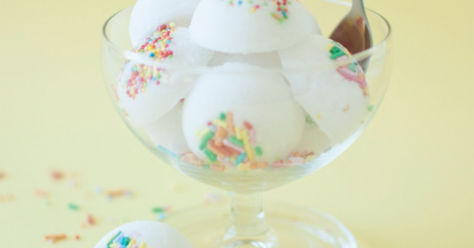 Maak deze bruisballen in snoepkleurtjes en besprenkel de ballen eventueel met ‘discoballetjes’ die je vaak op ijsjes ziet, voor een extra vrolijk effect.