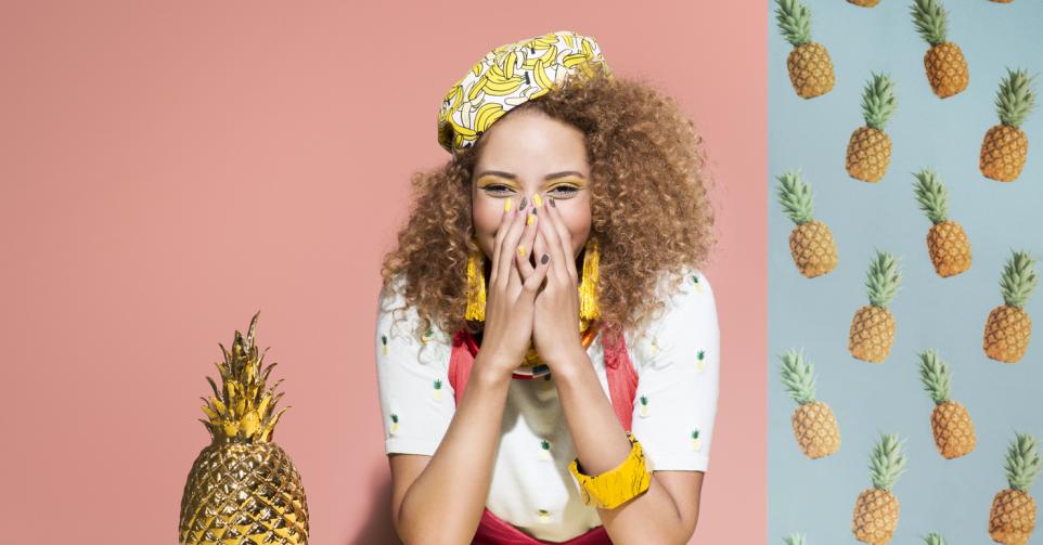 Je nagels hoeven niet kurkdroog te zijn vooraleer je het eerste laagje kleur aanbrengt. Lak meteen nadat je de basecoat hebt aangebracht, je nagels met het felgele Be A Pineapple. Buiten één accentnagel, die laat je voorlopig blanco.